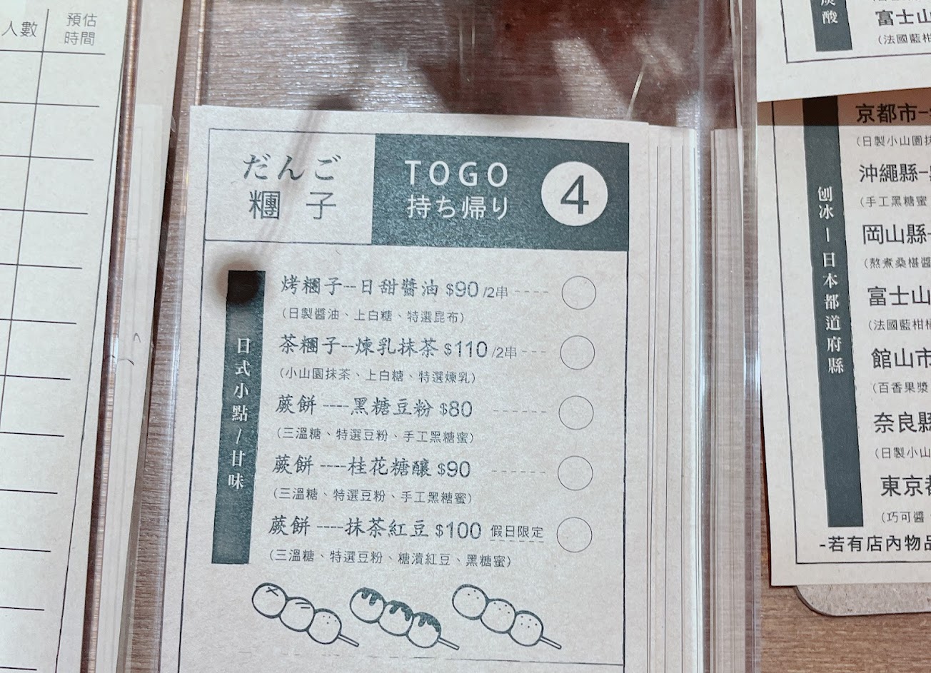 店裡雖然有點小裝潢跟氛圍很舒服,內用基本消費(120/人),有糰子、刨冰、蕨餅可以選擇。