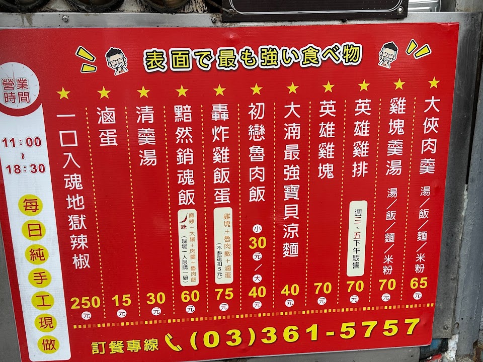 老闆為人客氣和善,餐點名稱都是老闆的創意,有黯然銷魂飯、英雄雞排、轟炸機(雞)羹飯…等等,還有壽星優惠喲!詳情請詢問老闆。