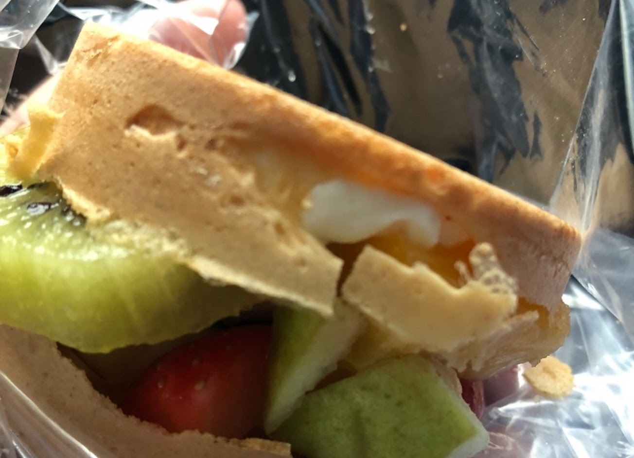 皮薄型的紅豆餅,所以建議盡速食用才會脆脆的,很好吃濃郁,水果給得很大方,焦糖海鹽裡面還包一點牛奶糖很驚艷好吃~