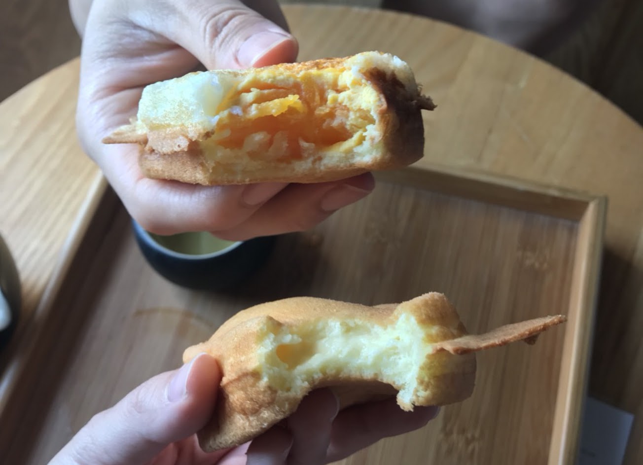 起士雞蛋燒使用紐西蘭香濃起司,滿滿地擠在雞蛋糕內餡,這雞蛋燒的背面不使用麵糊,而是又加上一整顆雞蛋,底部微焦的雞蛋,光看就覺得很可口,而且半熟蛋的滋味實在太厲害!在嘴裡炸開的蛋黃,讓人著實滿足。