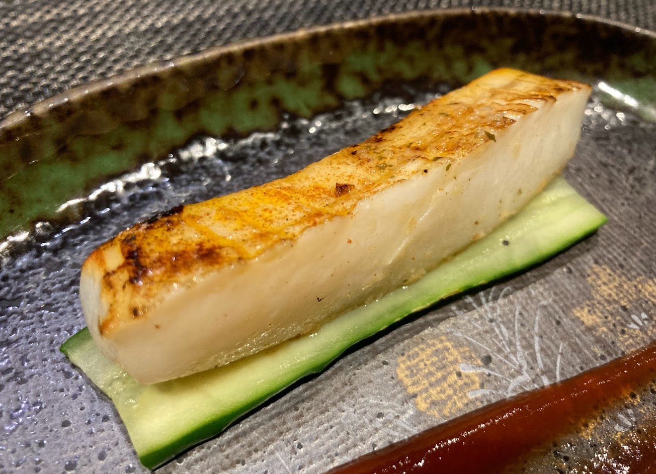 干貝(1500套餐)超大一顆!讓我目不轉睛的從煎台上就一直盯著一直到放到我眼前? 調味方式我其實沒有很愛,我個人喜歡干貝的調味越純粹越能吃到干貝的鮮甜,這裡搭配上了飛魚卵(在煎的時候還有別的調味料)旁邊還有黃芥末,其實吃不太出來干貝本身的鮮甜,蠻可惜的!