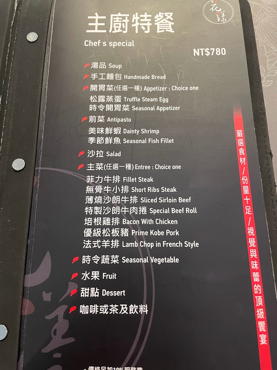 在餐點上印象比較深刻的有松露鵝肝魚子醬蒸蛋(開胃菜)、清燉海鮮(湯品)、龍蝦(前菜)、羊排(主餐),