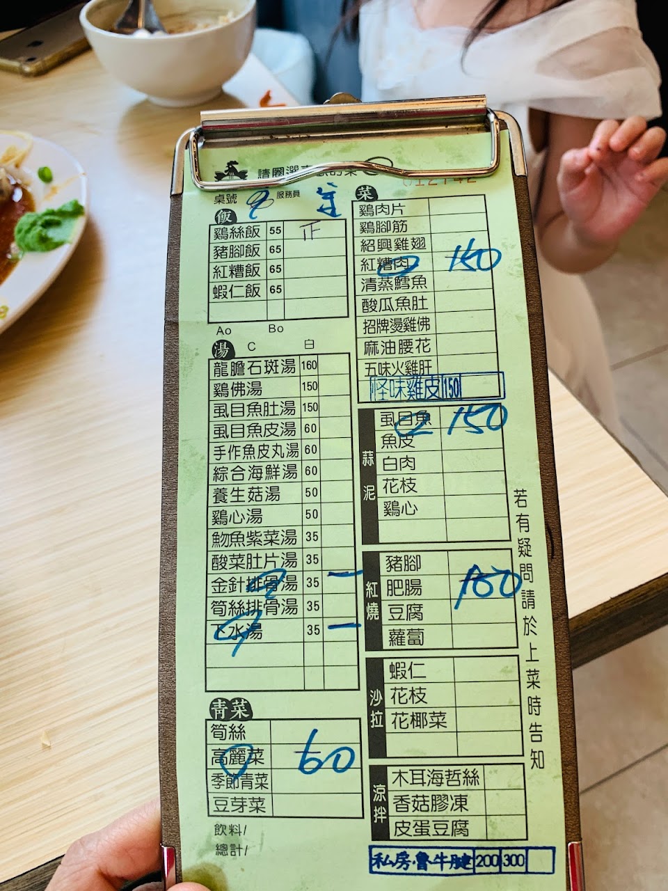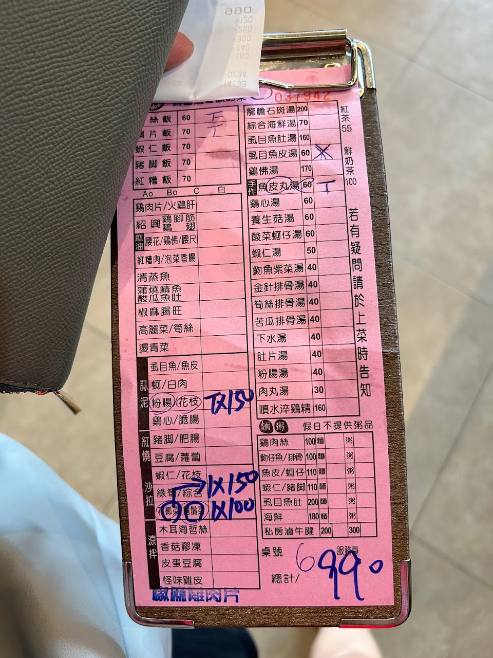 價位偏高,兩碗雞肉飯、一碗雞片飯、一份紅槽肉(100元)、一碗苦瓜排骨湯(湯好喝清甜,苦瓜也不會苦)、一碗下水湯(只有雞胗!!)、一份燙空心菜(淋的蒜泥肉燥很好吃?)總共390元,兩個人吃份量是不夠的