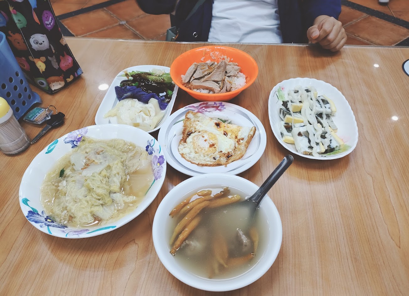 點了雞肉飯跟雞片飯,雞片飯超級好吃!一定要加荷包蛋但如果可以半熟會更好!金針湯便宜好喝!小菜點了茄子?也覺很好吃! 下午沒有休息很方便!