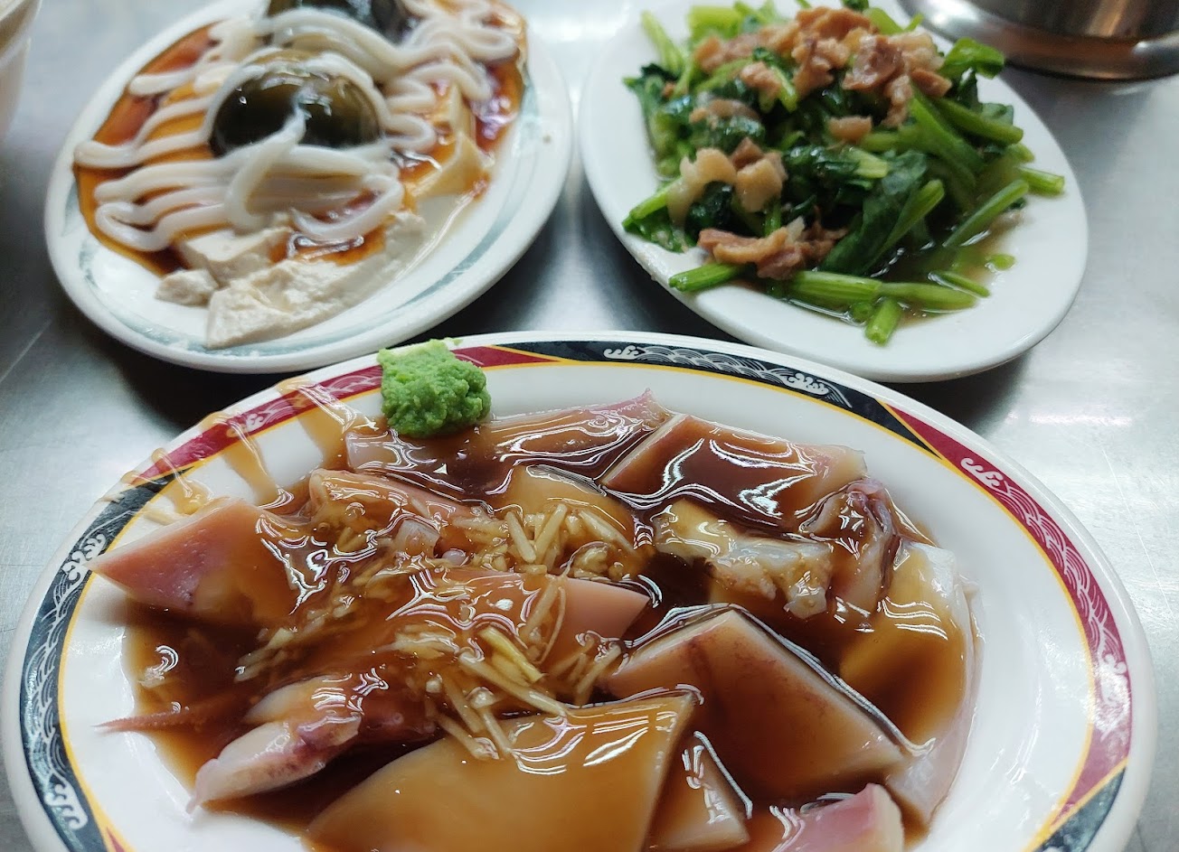 到夜市怎麼能不吃點好料,簡單的雞肉飯,魷魚,湯青菜,皮蛋豆腐,一整個大滿足!