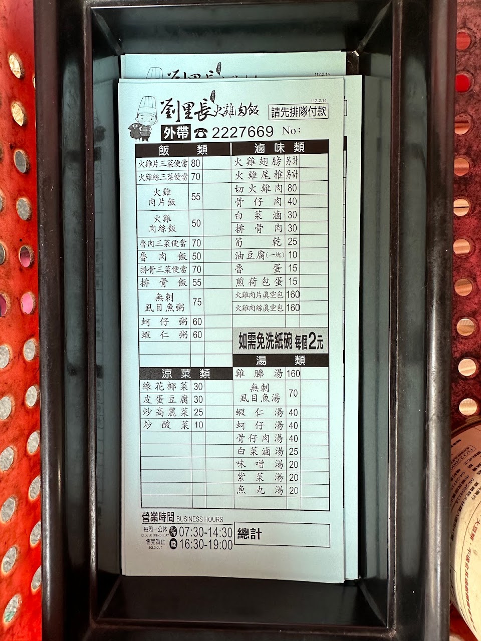 非假日中午用餐時段不用等很久即可內用,填寫好菜單後先到櫃檯買單等候老闆叫號入座。建議點雞肉片飯比較吃的過癮,國民平價美食當之無愧……