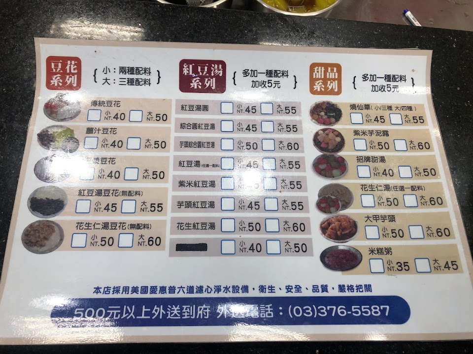 芋頭、花生、紅豆、綠豆類熬煮充份非常綿密,用料實在、給料大方,買豆花光豆花和配料還沒加湯就已經快7成滿了,大碗吃完就飽了,是CP 值很高的甜品店,500元以上可外送。