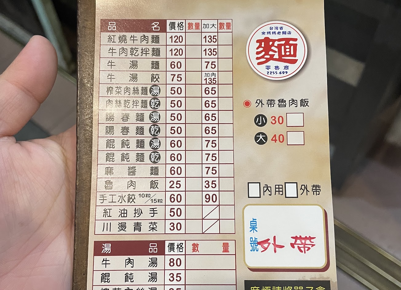 路過看到人很多就決定試試看,先找位置坐下再劃單,單子給店家後盡量不要再換座位。煮麵區跟滷味區是分開點餐的。店裡雖然有開冷氣,但因為門跟窗戶是打開的所以不能期待很涼爽。