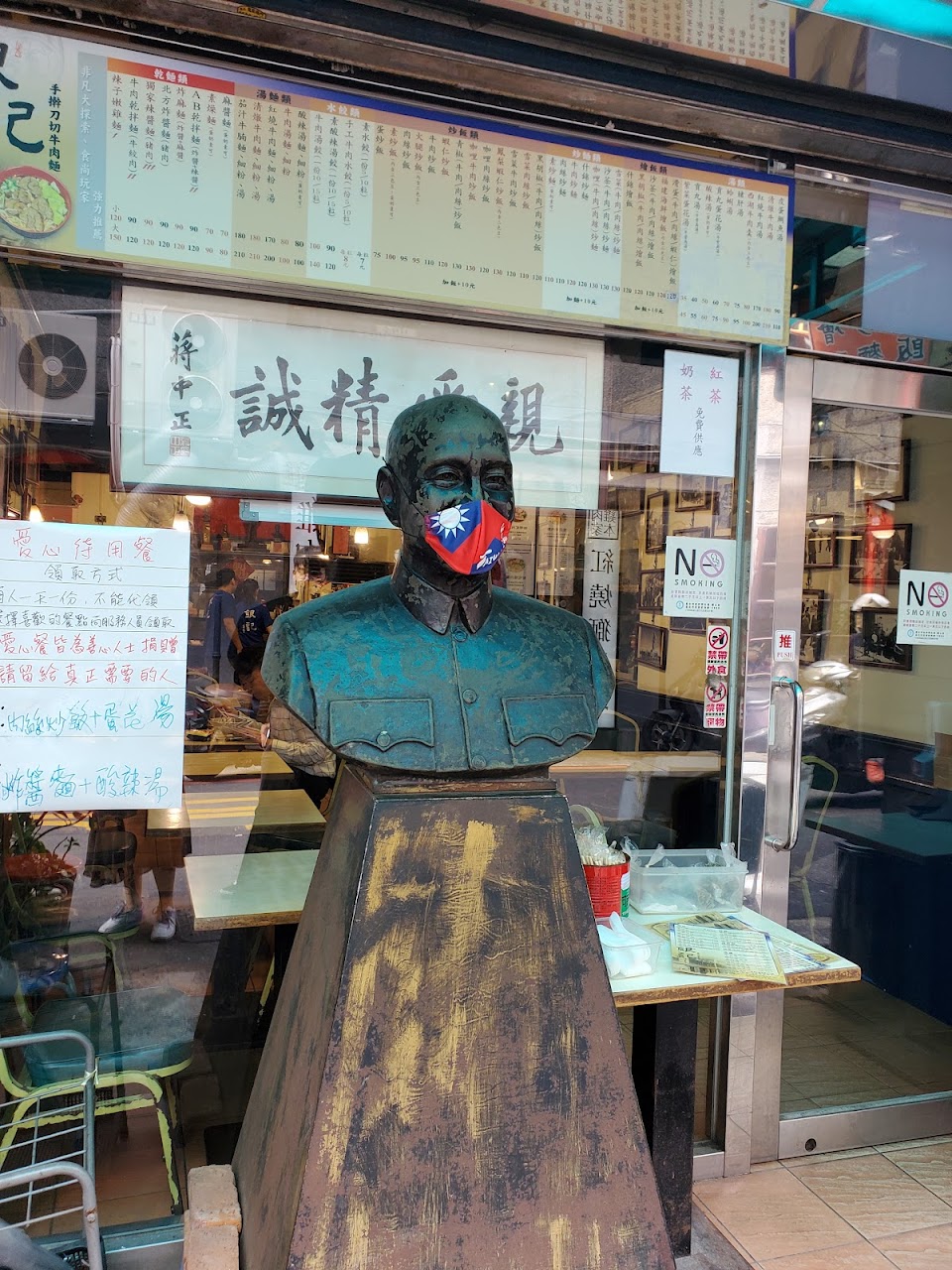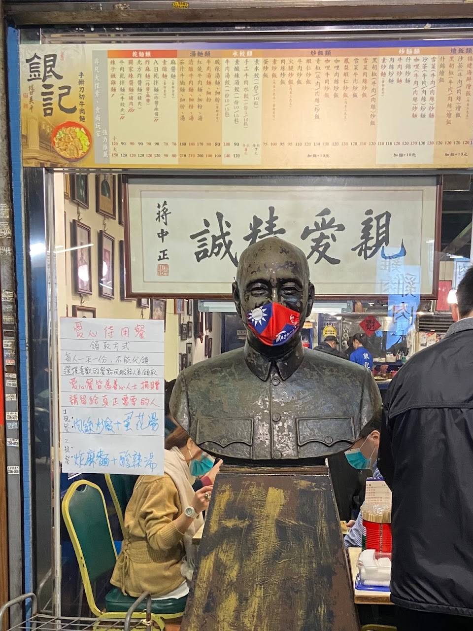 銀記手擀刀切牛肉麵特別的外觀吸引了我,門口放了座蔣公銅像致意。