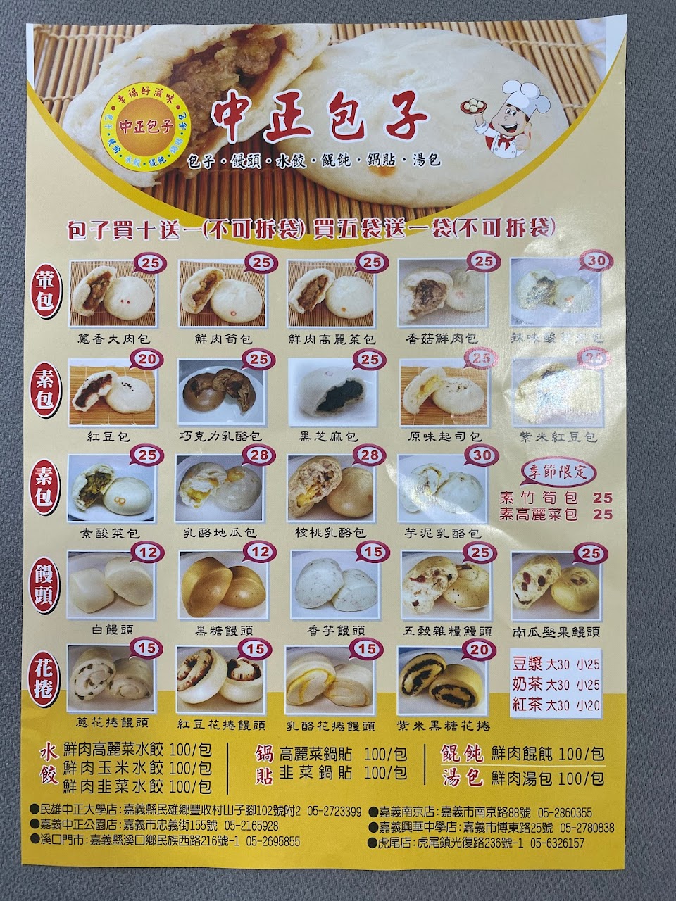 中正包子在嘉義的中正公園有一間店。還有在中正大學附近有一間店。中正大學那個是最早開的店。很早起很早以前就吃過中正包子,那時候的包子真正是用手捏的麵皮跟他的內餡都是手工拌的真是非常好吃。那時候價格也比現在的$25元少5元或10元,已經忘了,反正不是一顆$25現在改成用機器反而漲價。想念以前。你問他一定不承認。像民雄肉包、鹿港包子都是機器包的。機械包因擠壓麵筋外皮口感會變差。內饀呈現圓球狀,手工包外皮Q彈內餡是分散的。