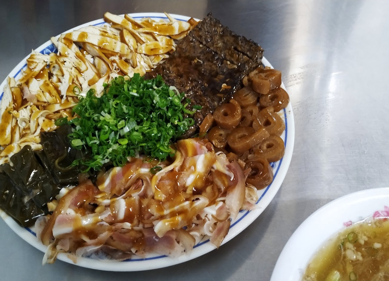 此處首在滷菜擺盤實在絕活,光是看著店家切菜的速度和刀法該說就不虛此行。豆干快節奏的下刀,絲絲卻不碎裂,一筷夾入多條,大快朵頤;豬頭皮則是改以斜刀片片,使每片均帶有肉帶筋,上桌開花似的擺開,中間放同樣細切蔥絲,淋以南部醬油膏、香油,滷菜香而不鹹,所以再加點桌上辣渣更好。