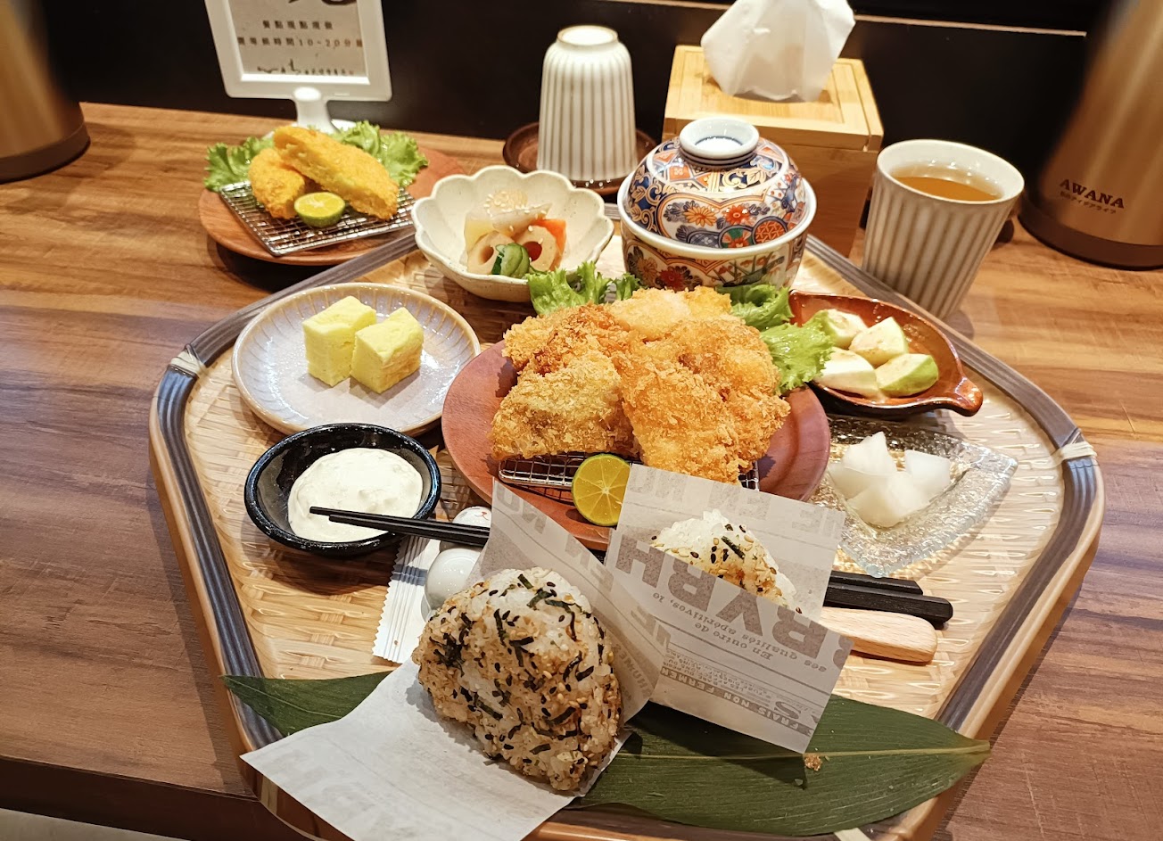 鮮蝦蘆筍手卷、蒸蛋、唐揚豆腐、烤鮭魚定食、唐揚豚肉飯糰定食。