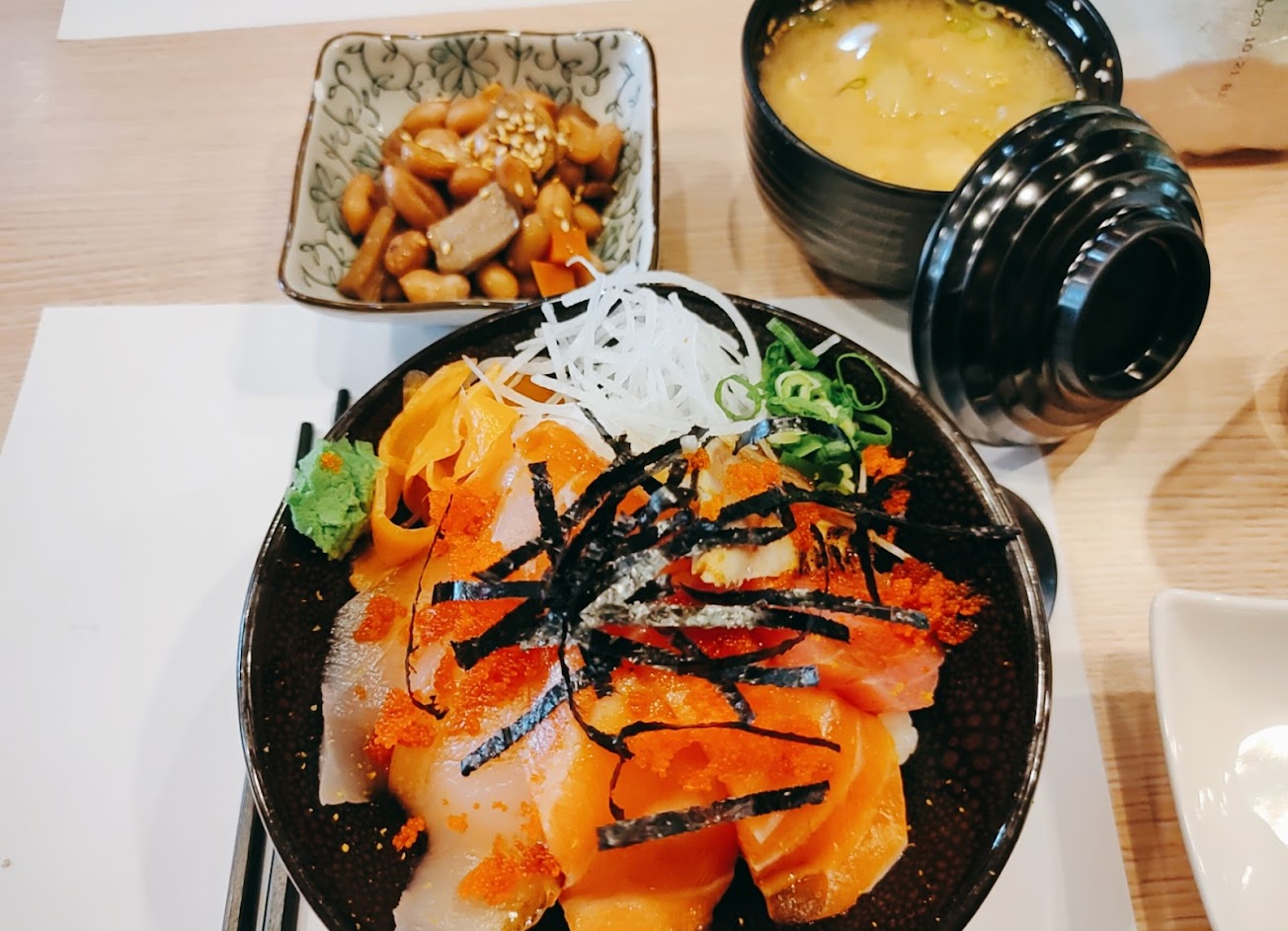 #生魚片丼飯 (蔬果沙拉、小菜、湯品、茶碗蒸) 給料超豐富,有鮭魚、鮪魚、還有生蠔等等 特別要說一下湯品!味增湯也是加了鮭魚去煮, 味道更鮮甜,還可以吃到鮭魚肉~ 當天小菜是苦瓜,茶碗蒸裡有蟹肉棒跟蛤仔~