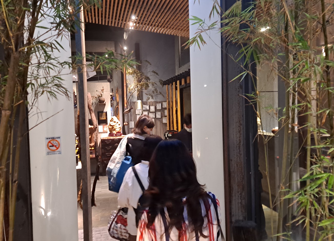 進入店內,要先享受竹林長廊和水霧,讓人有心情準備用餐,店門口,服務人員親切接待,併為每個人量額溫和手部消毒,接著被店內寬敞和裝潢吸引。