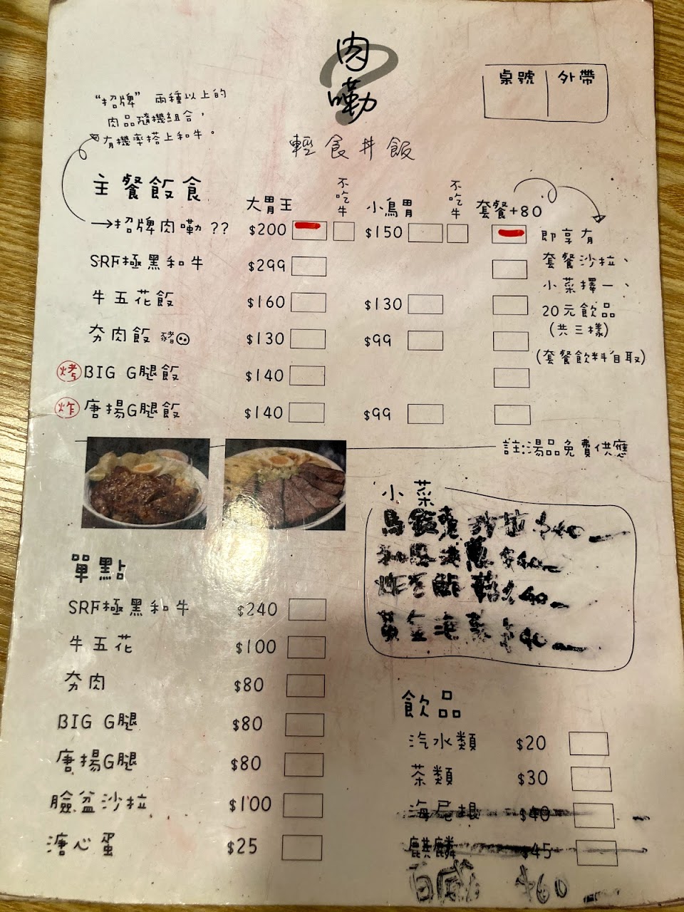 如其名,喜歡吃肉的顧客應該會覺得很滿足的食堂。 有免費提供的味噌湯喝到飽,而且湯裡的豆腐、海帶芽很多~ 但是餐點裡面跟蔬果比較扯得上關係的只有兩片薄薄蘋果、高麗菜絲和炸馬鈴薯片,所以注重均衡飲食的人可能要注意一下XD 個人推薦唐揚雞,酥脆好吃,炸雞上的淋醬酸酸甜甜讓炸雞不會那麼膩口,醬汁配著高麗菜絲也比較清爽順口。 大雞腿個人比較沒有那麼喜歡,可能是碳烤時間太長有點焦味… 飯量很足,一般女生食量點小鳥胃就足夠了!99元可以有炸雞丼飯和無限供應的味噌湯,CP值算不錯。 此外店內有放置小便條可以留言,牆上也有以前其他客人的便條記錄,滿可愛的。 因為我自己是不吃牛,所以牛肉類的餐點就是屬於未知領域了。
