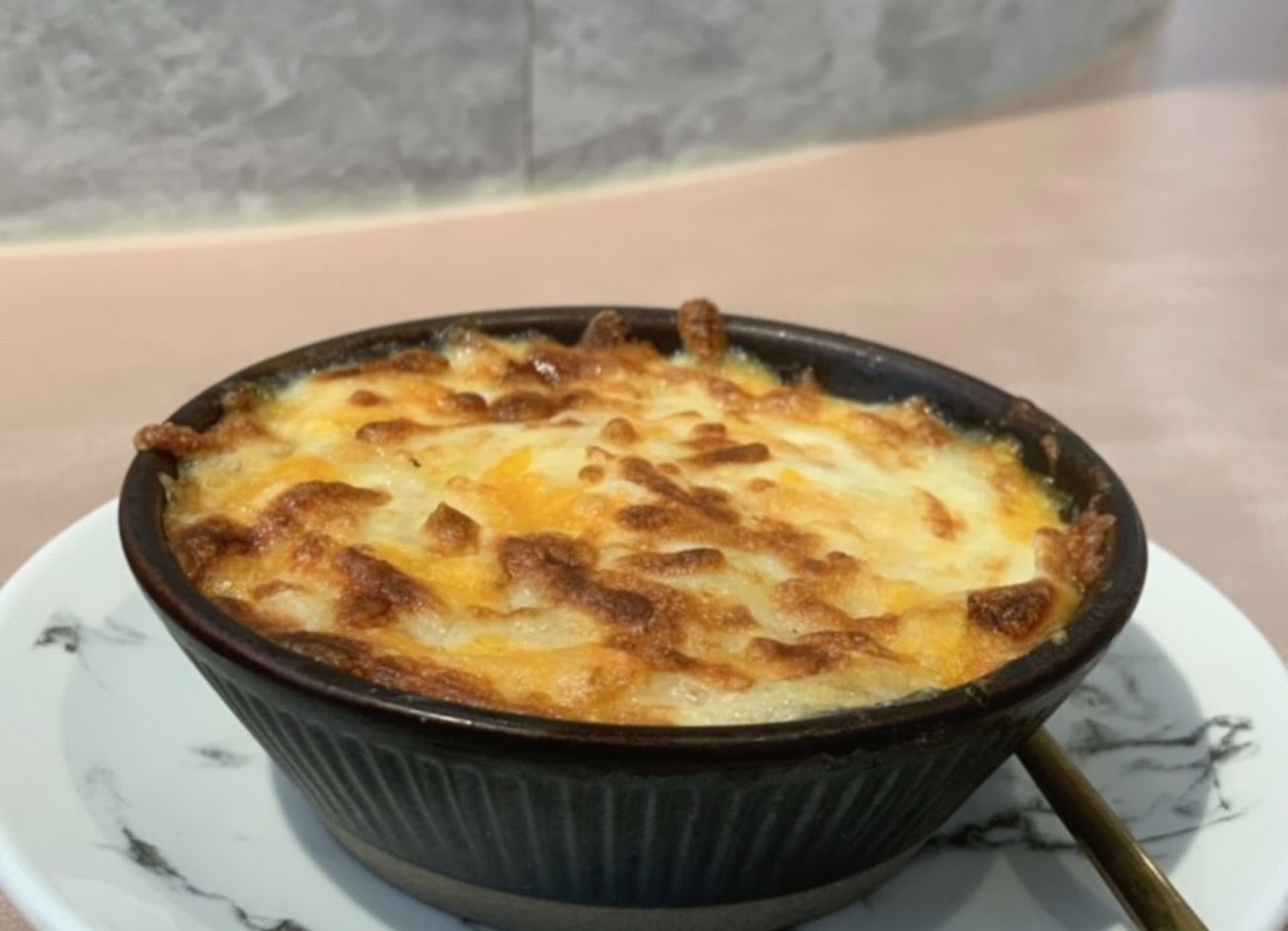 約直徑8公分左右的大小,配料豐富、無派皮,表層起司挖開看見的是內部很濕潤,吃起來當然也是。口感勉強算得上西式海鮮粥,但個人覺得更接近白醬海鮮濃湯。