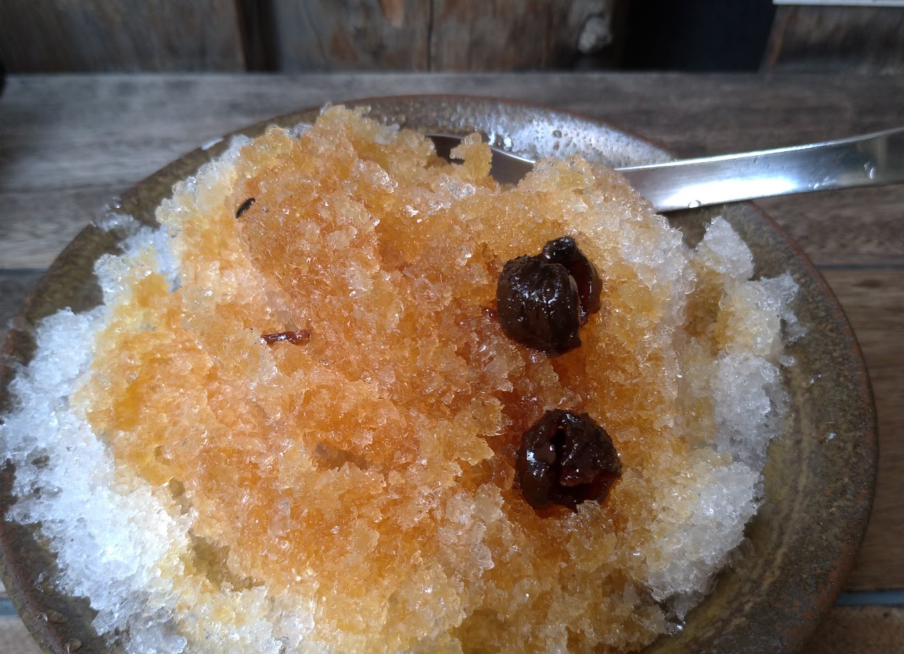 與雪花冰或刨冰店一般的細刨冰不同,刨冰顆粒偏粗,沒那麼容易融化,但糖分也沒那麼容易融進冰裡,所以到後面吃起來會有點白。碗底偏高,看起來精緻,適合拍照打卡。