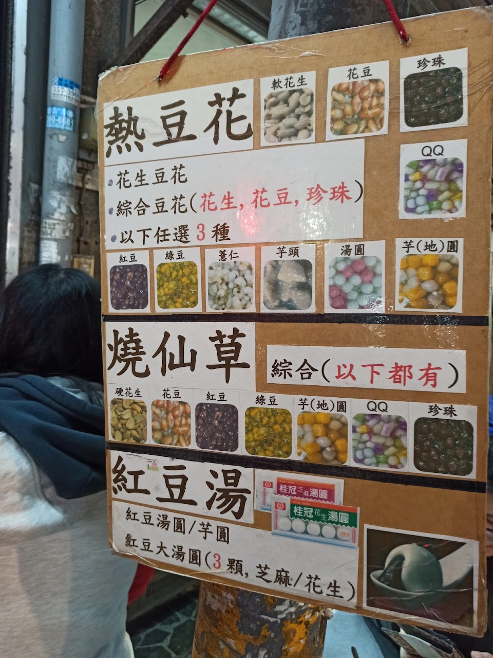 他們還有各類品種:冰品、燒仙草、湯圓、紅豆湯。豆花可以根據自己喜好,加入你喜歡的配料。