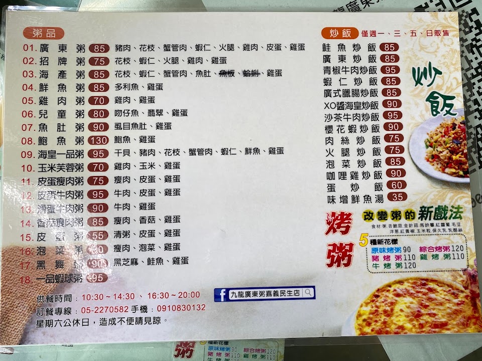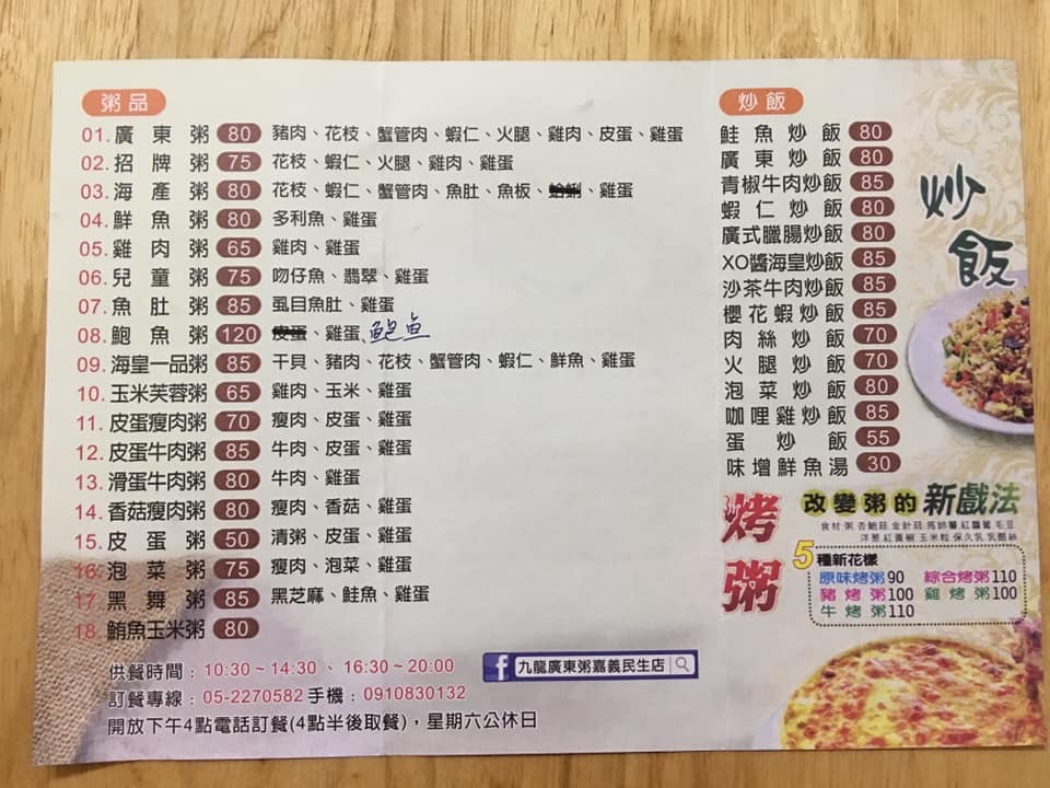 本人今晚很想吃廣東粥就古歌了一家在嘉義民生北路上的九龍廣東粥它竟然在我常買的麻婆魯味的斜對面我竟然不知!點了一碗皮蛋牛肉粥回家吃~超級好吃料實在味道好,不像有的店家用白飯直接煮一下就好,九龍廣東粥真的好吃而且老闆跟老闆娘很有禮貌很親切會跟客人聊天招呼有問必答,我終於找到好吃合我口味的廣東粥,店家有有各式炒飯跟焗烤我以後會常去光顧的