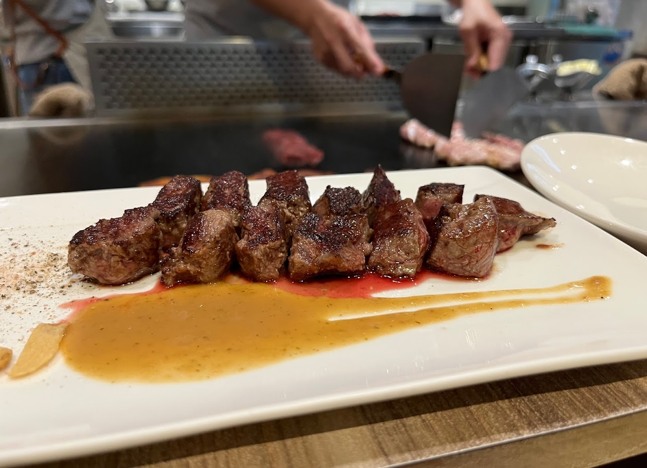 上菜上很快(XD) 適合快速吃一頓鐵板燒 CP高、牛肉很嫩 但是要提早預訂或排隊