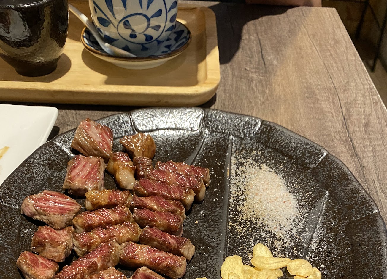 ?牛排熟度為7分熟,每一塊大概就是骰子牛大小,一口吃下配一點飯剛剛好,搭配旁邊的蒜片、玫瑰鹽和黑胡椒是很傳統的吃法