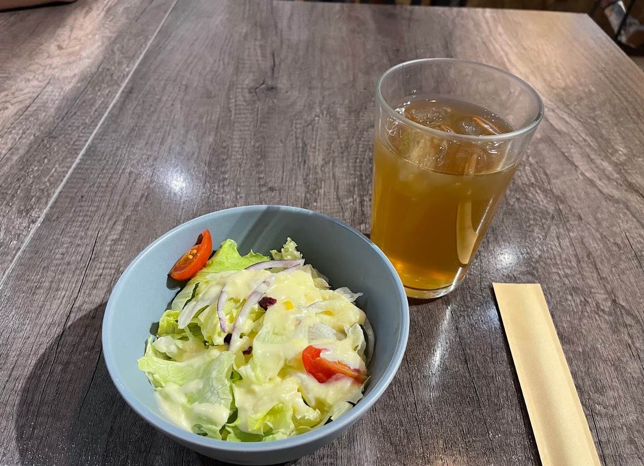 套餐包含沙拉、飲料、白飯、雞湯、蒸蛋、炒菜、主食以及甜點