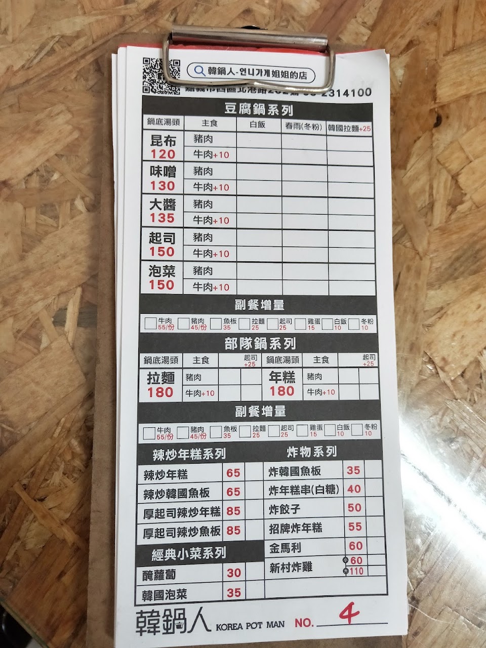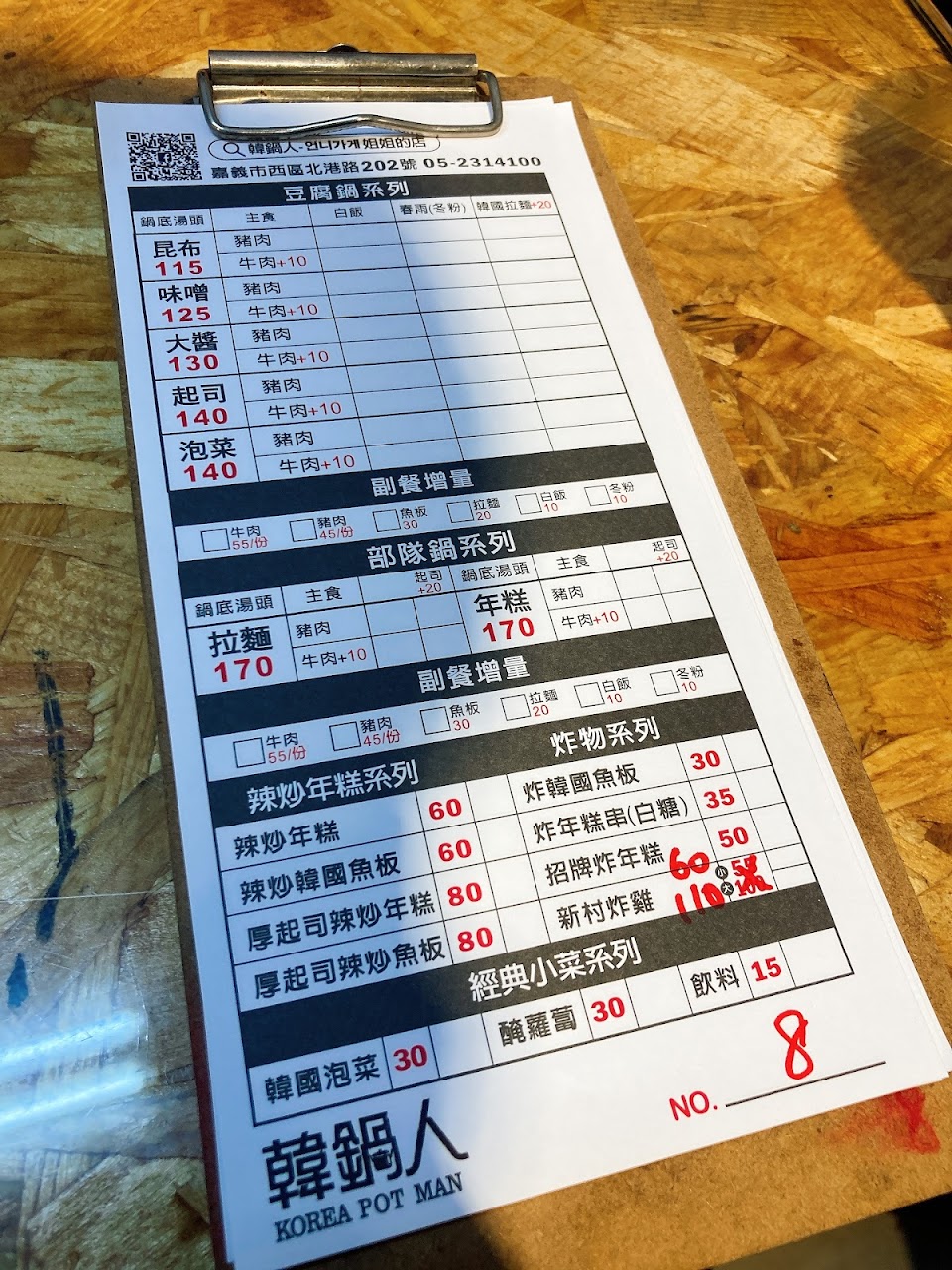 部隊鍋內容豐富,拉麵口感很好,豆腐很嫩,湯汁好喝,加上前菜韓式泡菜,口味特別。整個吃完好有飽足感,價位也很平價,還有親切+很正的老闆娘,真的不虛此行。推薦給大家,來嘉義市區可以去吃,讚?。