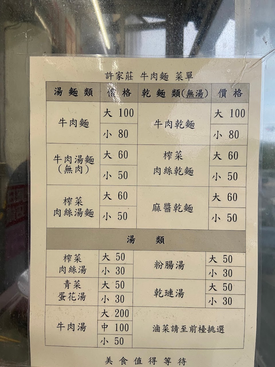 CP值高,麵食跟滷味都相當好吃,價錢跟那些所謂的名店相比,價錢真的是佛心來著.真的超推許家莊,老闆人也很客氣,唯獨小黃瓜有點小失望,沒有入味,建議老闆可以用拍的,可能會比較入味,切段的方式吃起來小黃瓜是小黃瓜,醬料是醬料.呵呵.不過牛肉麵真的非常好吃.給五星評價.