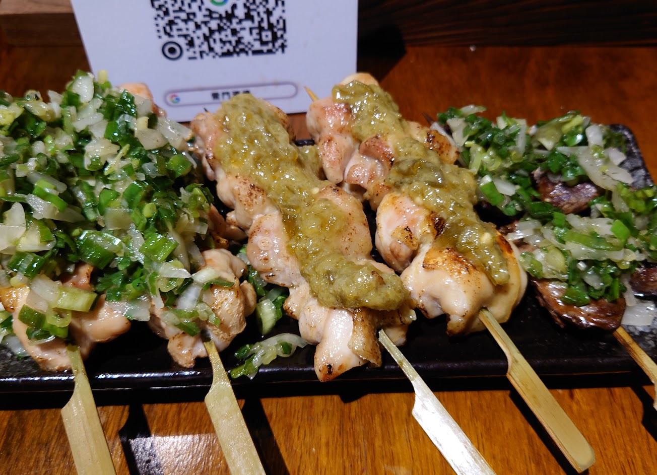 雞肉串非常的Juicy所以我們決定再加點不同口味的雞肉串,店員推薦蔥鹽雞肉串,滿滿的蔥鋪在雞肉上面,非常清爽的口感,蔥鹽味直接在嘴巴裡爆開,如果喜歡蔥的味道,這道菜一定必點,帶點鹹又帶點嗆味的雞肉串,搭配酒也是非常適合。