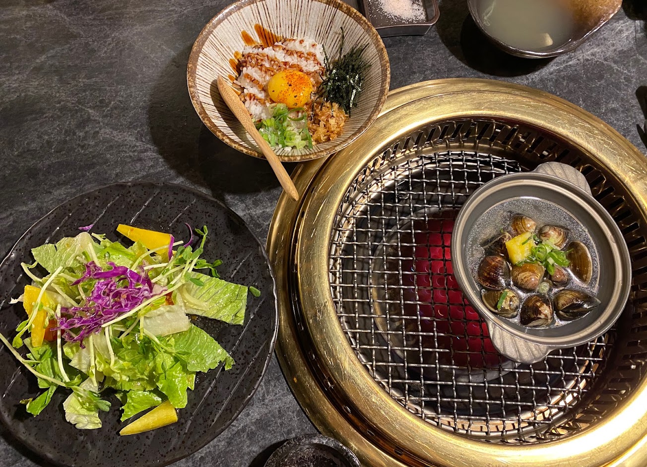點雙人全牛套餐,肉算好吃,有沙拉、主食、還有很多肉,量滿多,這天兩個人去吃超飽,肉質還不錯,主食我們點了鰻魚飯跟月見飯,意外的都很好吃!這也可能是飽足感最大的來源,吃到大概2/3就已經快吃不下了。