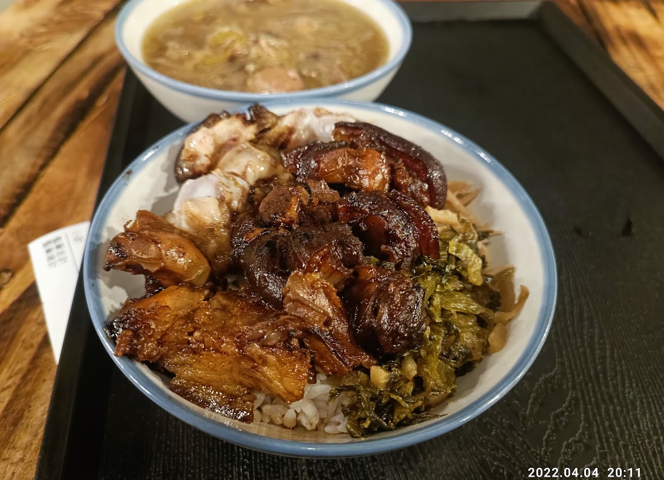 蹄膀軟嫩、米飯Q彈,搭配鹹香醬汁實在很古早味,配菜有筍乾和鹹菜,以及一碗菜尾湯,尤其是湯的味道經典、好吃,只是整個便當的價格與份量不成正比,實在是吃不飽。
