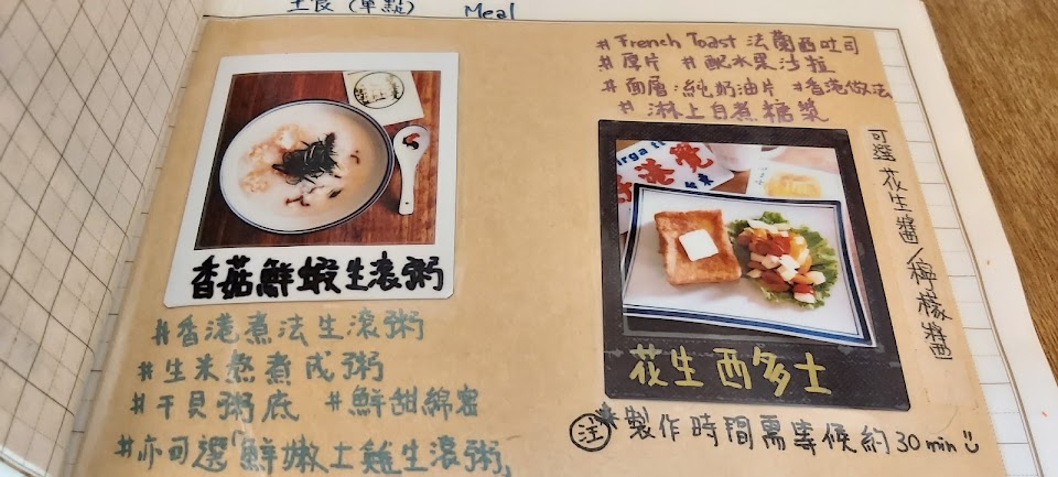 檸檬奶油豬仔包好吃 它們的檸檬味道讓人聯想到義美出的檸檬軟糖就是那個味道 怕太甜的人建議點別的口味 ,粥味道太淡像白粥愛吃重口味的人建議別點 ,奶茶很好喝很順口不會太甜 去的當天很多商品都沒有了也有點趕時間所以沒有點很多 ,聽別桌的客人都有點西多士 環境衛生不錯 廁所內有點暗 服務態度好 手繪菜單很少見 店內餐具都很環保 吸管好像是使用玻璃吸管 要吃一定提早到 我姐就撲空了好幾次室內裝潢的很文青 價格 中價位