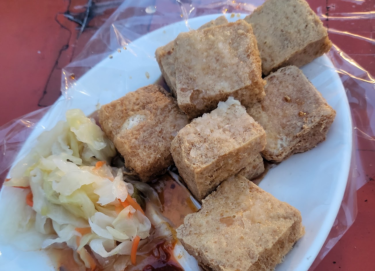有一些其他夜市沒有的東西,這次在地人帶我去,跟我說排隊小吃不一定好吃,沒有特別推薦。我們買了夜市尾的東山鴨頭,排骨酥,40年臭豆腐,