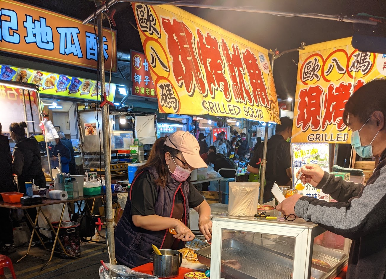 路很小條不是很好走,夜市入口處的東山鴨頭很難吃,喜來登外面的烤魷魚還可以。