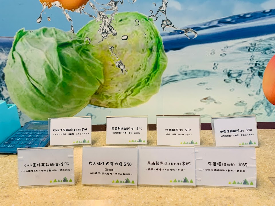 店面很乾淨,不會有一般做吃的店家那種油油髒髒的,座位也不少,然後我們就往後方的甜點展示櫃,一看很驚訝呢,許多漂亮但我不知道名字的派跟糕點好好的躺在上面,雖然他有牌子,可是沒有放在蛋糕旁邊,而且價格比台東市或是其他縣市那些知名的店家便宜了不少,於是我們就點了兩個鹹派(有肉),檸檬塔(很酸),生巧克力塔(苦味但很好吃),這幾個也是我推薦可以試試看的品項。