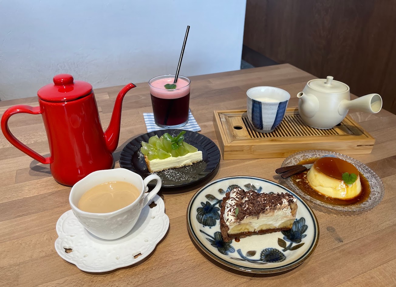2023/4 回訪 帶著一群朋友來,大家都很喜歡這裡感受到的氛圍,飲料甜點點了一堆。 一致好評的是那顆布丁?! 再來是上面鋪著青葡萄的乳酪蛋糕非常清爽。 下層是香蕉的那一塊比較偏甜。 飲料部分~ 柑橘類的兩杯飲品,柑橘味道都不夠凸顯。 水果茶很清爽止渴,有點意外好喝。 朋友很愛自己點的Mojito,也算清爽。