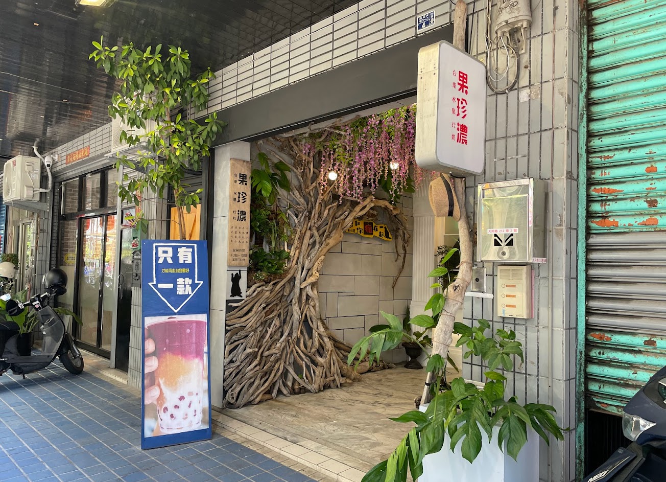一杯美麗又好喝的水果珍珠,原本在旁邊吃米苔目看到通行友人去旁邊小巷裏買了一杯色彩繽紛的果真濃,喝一口驚為天人立馬起身去再去買個幾杯,走進這個紫藤花的巷子後發現裡面的佈置好特別,走進裡頭別有洞天裡面的佈置讓我張大眼睛,不只是水果珍珠好喝裡面的一切更是讓我感到非常驚奇,有去台東記得去造訪一下果真濃