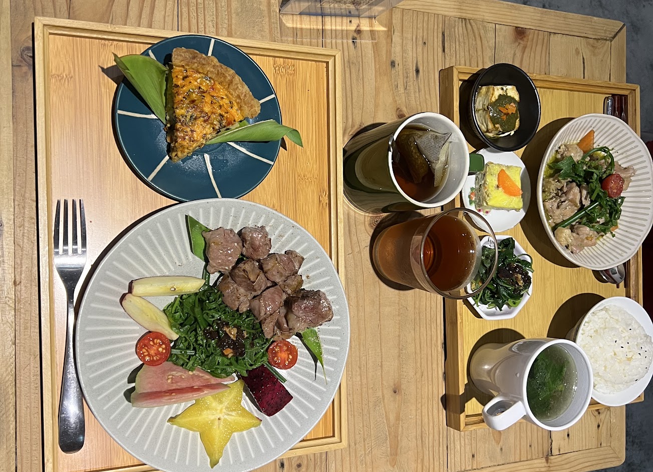 使用台東在地食材,搭配出不同的新滋味,小菜有荖葉醬豆腐、咸豐草蒸蛋、各種季節時蔬…以及金針花湯?
