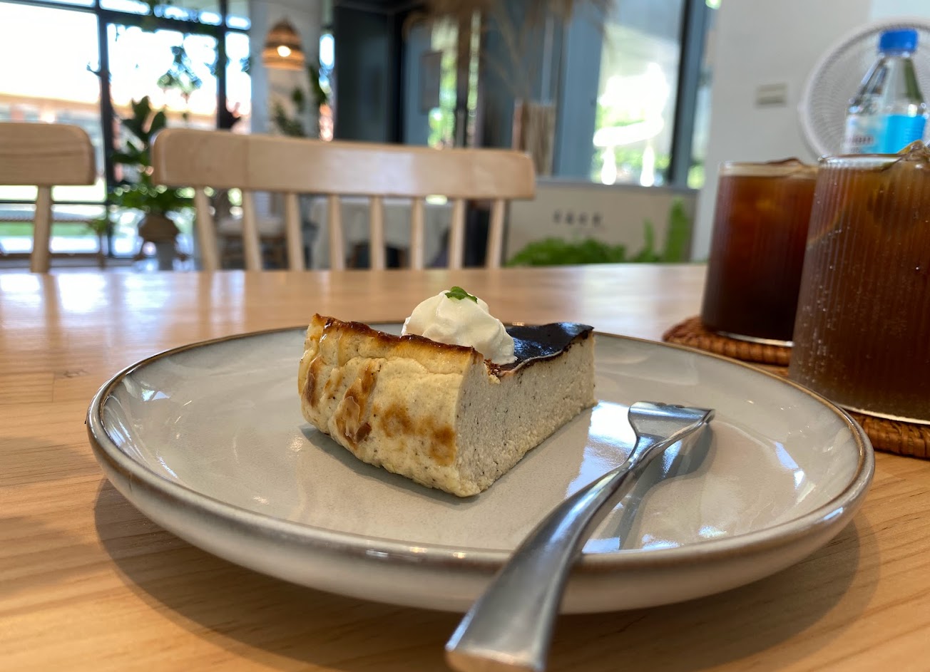 大片落地窗,很適合來悠哉度過下午。 與小農配合的楊桃康普茶($130)滿好喝的, 馬告巴斯克乳酪蛋糕中規中矩($130),比較像原味。