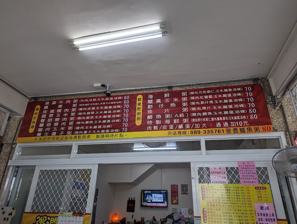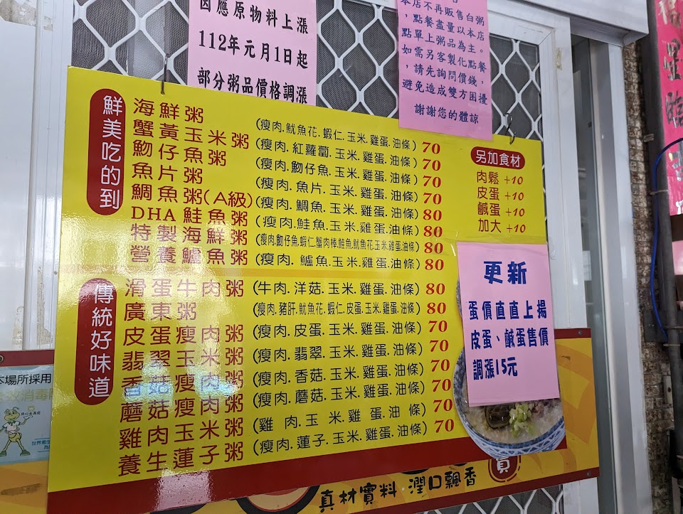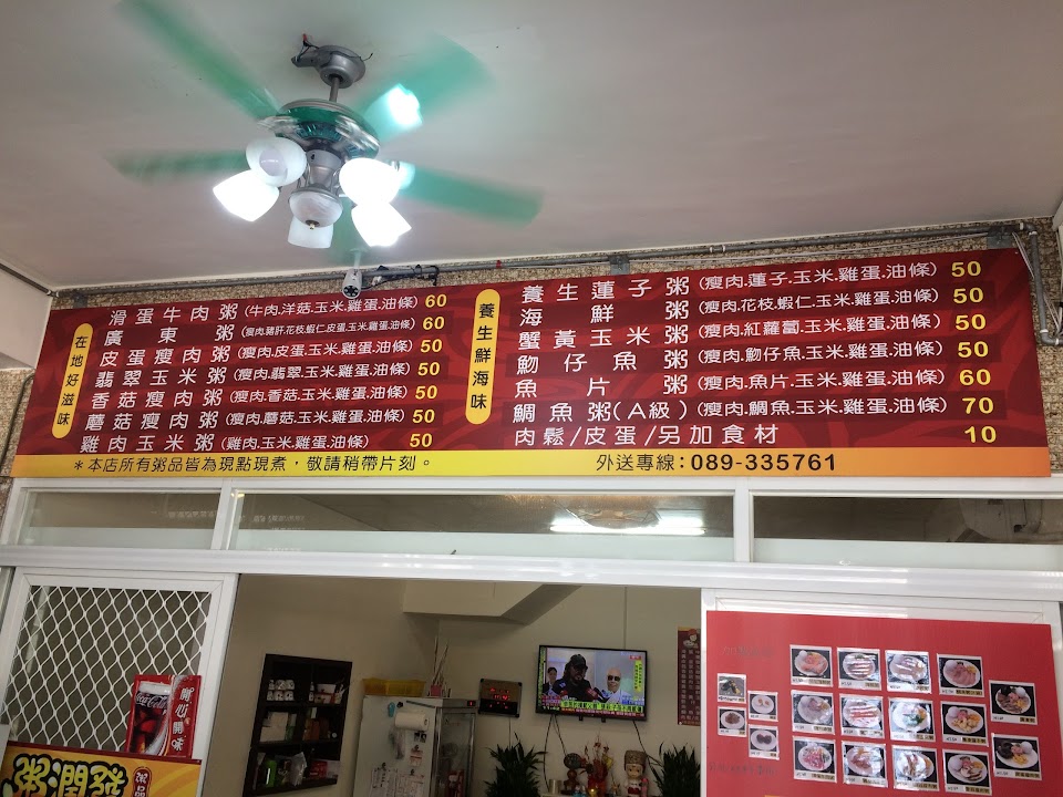 划算的粥店,店內粥是比較稀爛的型態,不是我們看到的飯湯是看不見米粒完整的樣式,粥一碗最便宜大概70,調味上清淡但是很好入口,之前有搬遷過位置不過大致東西都差不多,沒有提供內用的空間需要外帶,還能看到店家正在備料。可以自己選擇要不要加胡椒或者是蔥花,要提前說。份量來說就一碗粥不過對於很多人來說應該可以吃很飽。口感也是我比較喜歡的那種,飯湯的方式還是比較適合台南口味的。可以另外加料,牆上都有更新,門口不好停車。買回來再自己加料也是一個不錯的選擇。