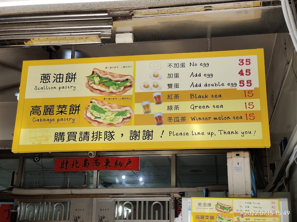 蔥油餅加蛋45元,九層塔好多,熱的真好吃,這裡排隊的人比較少~