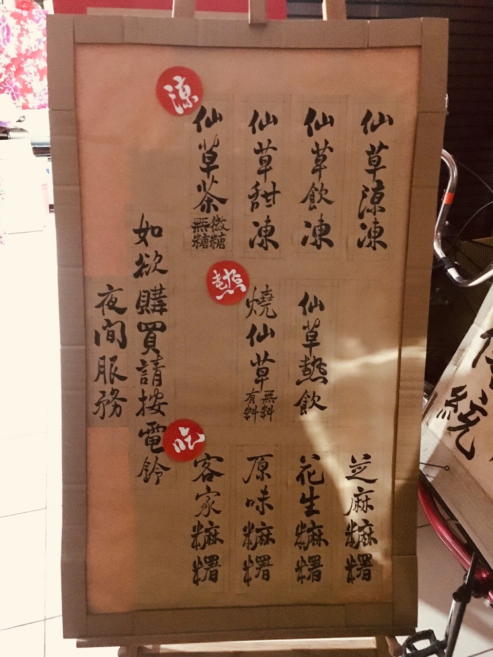 在家樂福旁的巷子 冬天紅紅的燈籠感覺很溫暖 有仙草系列如燒仙草、仙草凍 也有賣麻糬(假日才有) 麻糬有一顆一顆的,也有自己沾粉的客家麻糬 燒仙草可以選4種料 店內空間不大,以外帶為主要