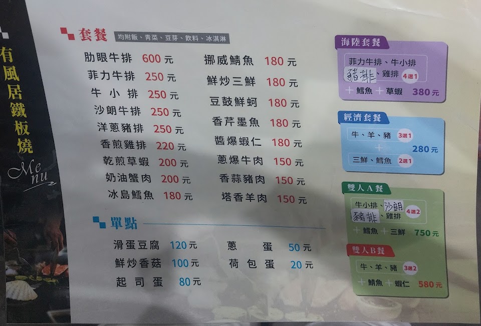 颱風天來用餐,撐著傘在門外問著服務員有‘’傘架‘’嗎?服務員手一指,沒說什麼話,原來傘要掛在門外立牌的上方,小小立牌掛不上就放地上了。 這裡沒錯的話之前是餃子館,營業場所本來就不大,現在入內後除了鐵板煎台後就沒什麼大空間了,算來不到20個位子。 點餐順利,白飯好吃湯料多,但飲品就沒什麼選擇了,也沒有標示,更沒有看到無糖飲料或白開水。 吃飽結帳準備離開時,告知女服務員今天的三鮮感覺不新鮮有一股腥味,,回復是會反應上去,業主您有收到反應嗎?結果是如何呢? ………… 當下為何不反應?因為我們四人分食幾口就吃完了。 服務 內用 餐點類型 晚餐 平均每人消費金額 $200-400 餐點:4 服務:4 氣氛:4