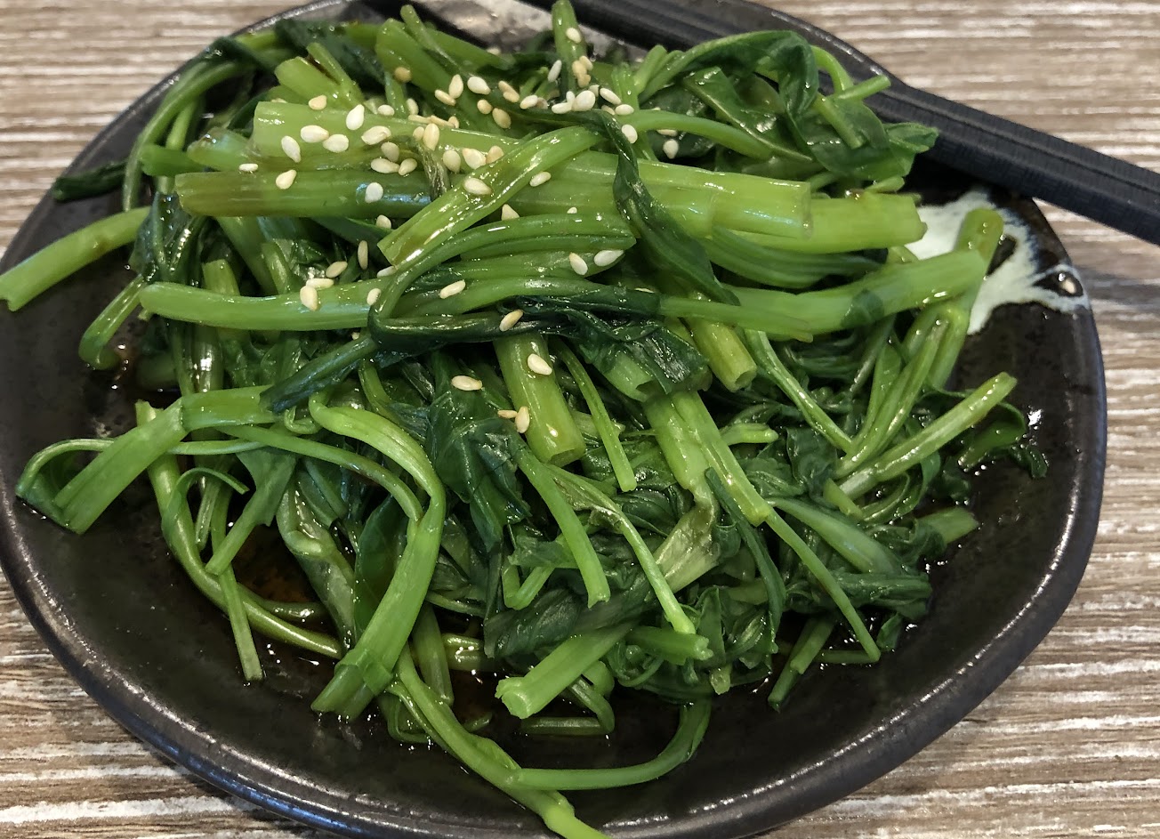 點了牛肉丼飯、旬野時蔬;牛肉丼飯,牛肉片軟嫩好吃,醬汁有烤肉香味;今天的青菜是空心菜,淋上日式醬油,口味比較甘甜;有免費的雞白湯可以無限享用。