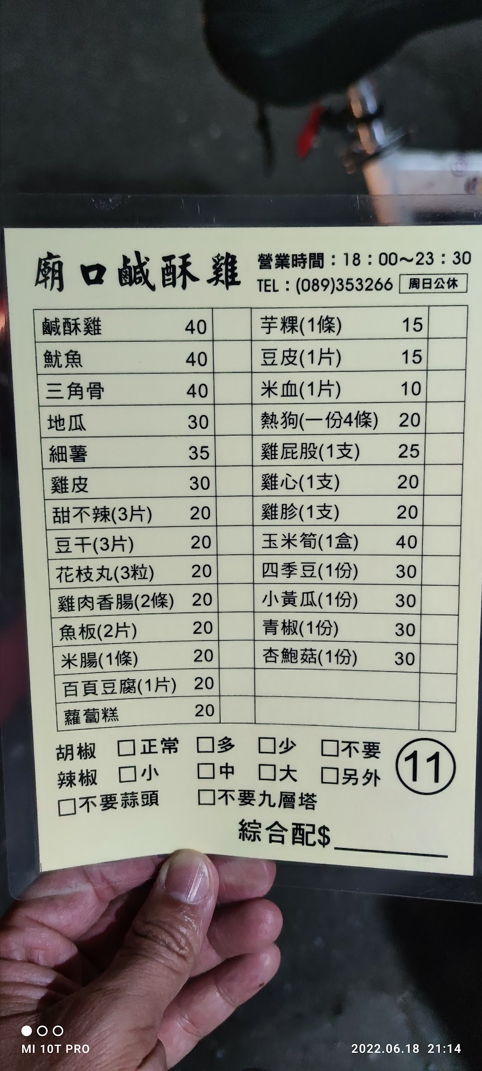 需要等很久的鹹酥雞,但真的非常好吃,提供菜單,可以先電話訂再去取餐