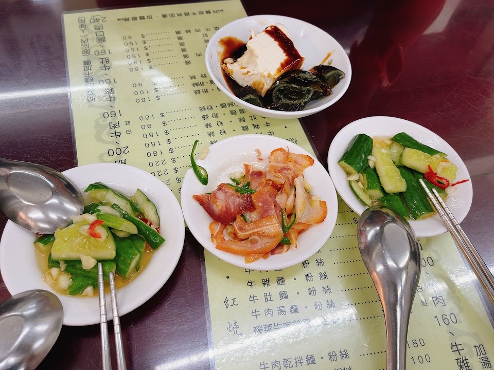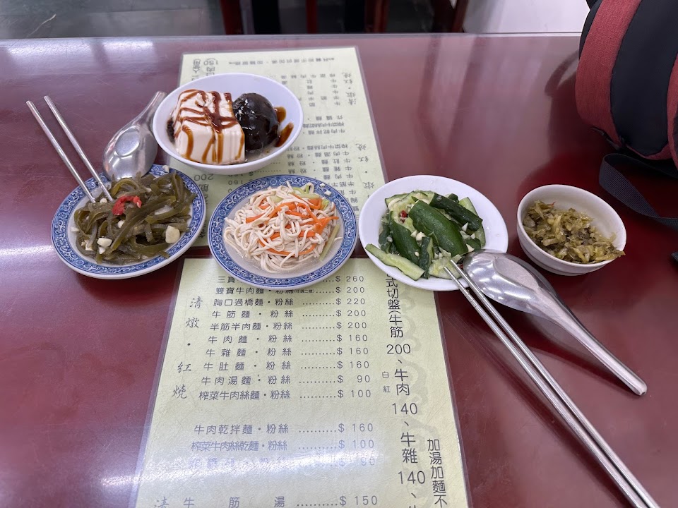 一踏進店裡就有一個無法言語的臭味,不知道哪裡來的,有點像抹布沒曬乾的味道但整間店坐滿人不曉得是大家都聞習慣了還是怎麼回事,牛肉麵的肉還蠻實在,紅燒的配大塊肉$200,清燉是配大片肉$160,牛筋有吃到軟的跟硬的,湯頭都是很清淡的那種,配上酸菜比較剛好,小菜的小黃瓜$30調味也淡淡的很清爽。