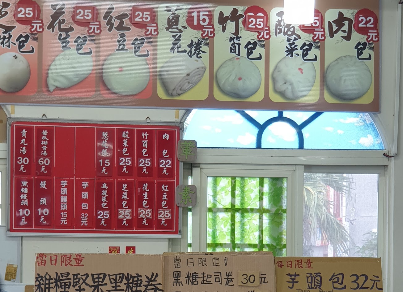 路過看見店很大室外的桌椅也不少 進店看看頗令人失望 一個賣包子的櫃檯另外一邊賣瓶裝飲料,包子一個大約25左右,無論店內使用或帶走全部裝塑膠袋,唉!包裝已經讓我猶豫要不要買,既來之則安之,買了筍包肉包紅豆包花生包各一個共計97元,口感就和便利買的沒什麼太大差別,唯一的差別是內餡 筍包口感差異比較大,肉包味道還可以,花生包就不推薦,紅豆包一般 整體來說吃一次就好 路過上廁所還不錯,停車位有