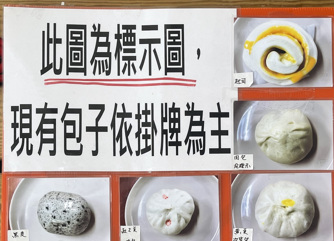 當時大排長龍人非常多,買了肉包.酸菜包 起司包.紅豆包各四個,結果上車吃的時候發現肉包沒有給而且把肉包拿錯拿成紅豆包,很掛張,而且上面標記的顏色一模一樣完全分不清楚該吃哪一個,還要把皮拋開才知道內餡是甚麼?。