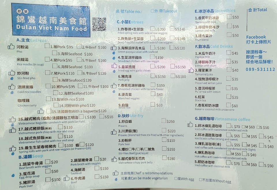 便宜又好吃 超高cp值的越南料理 是我吃過最讚的越南菜 25元的野菜牛肉湯超好吃 涼拌米線超美味 河粉湯濃郁又香甜 咖喱雞法國麵包香脆鮮美 木瓜牛奶45元好大一杯 都蘭餐廳都偏貴 但這家好便宜又大碗 物超所值 我可以在都蘭三餐都吃這家! 服務 內用 餐點類型 午餐 平均每人消費金額 $1-200