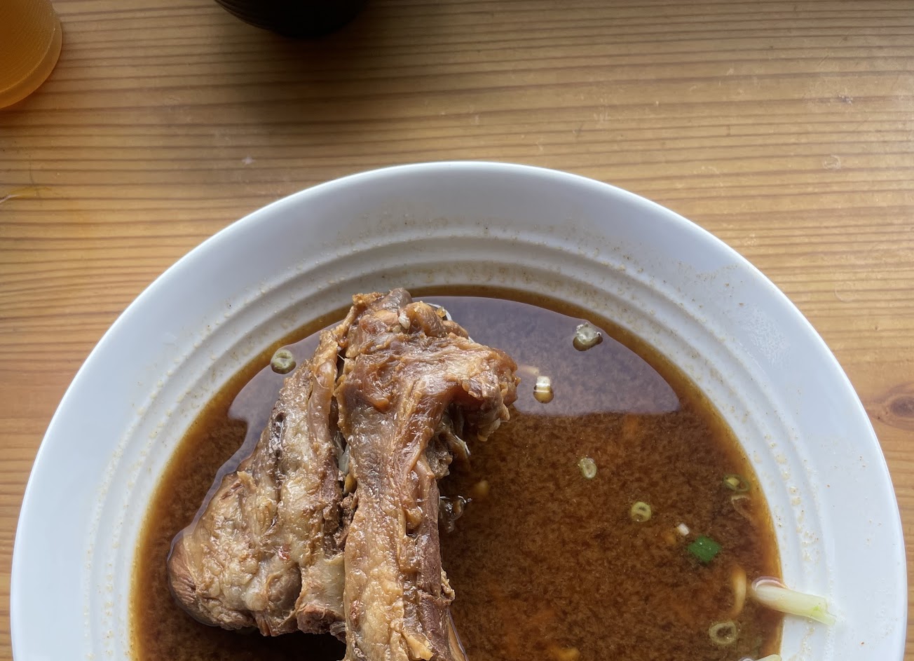 可惜的是,湯頭(比起其他吃過的標榜大骨料理的店家)並沒有期待中大骨熬煮的濃郁和甘甜,比較是鹹的醬油味,也有其他碗(豬肉麵)的湯頭是屬於比較淡的。並且麵條可能煮太久了偏軟,沒有彈性也不太入味